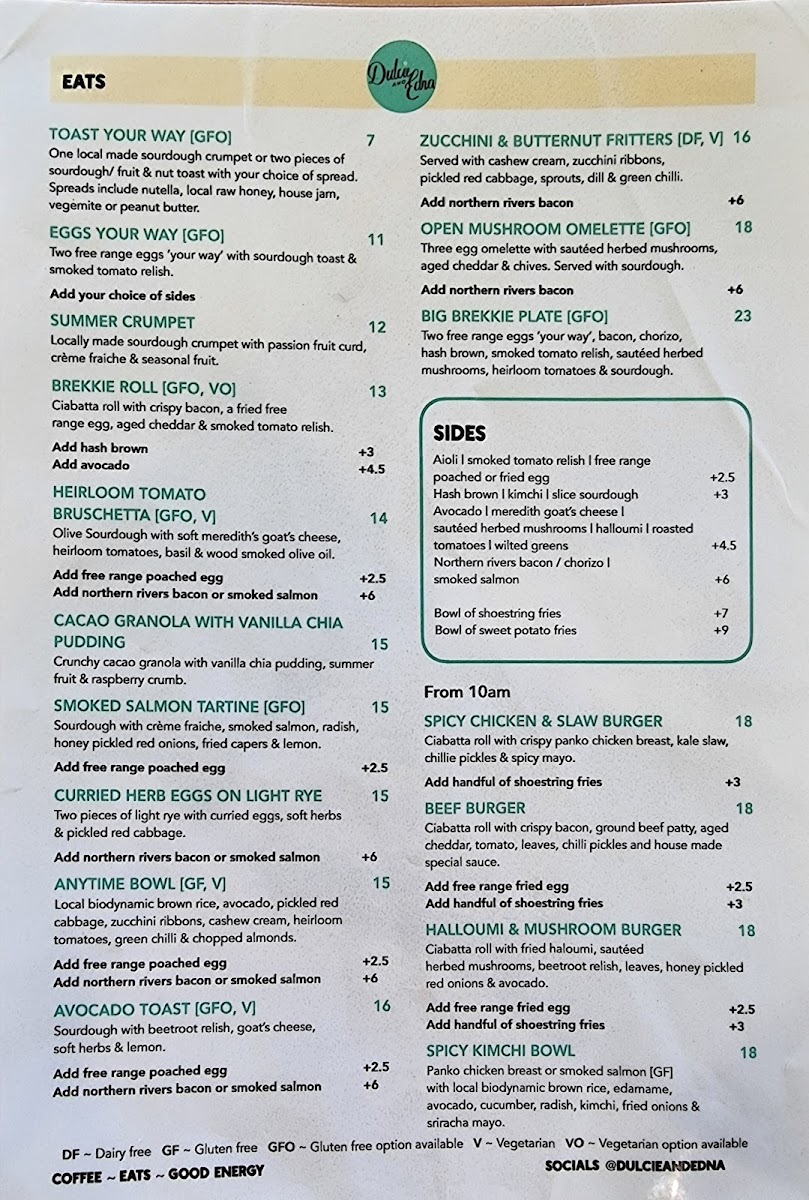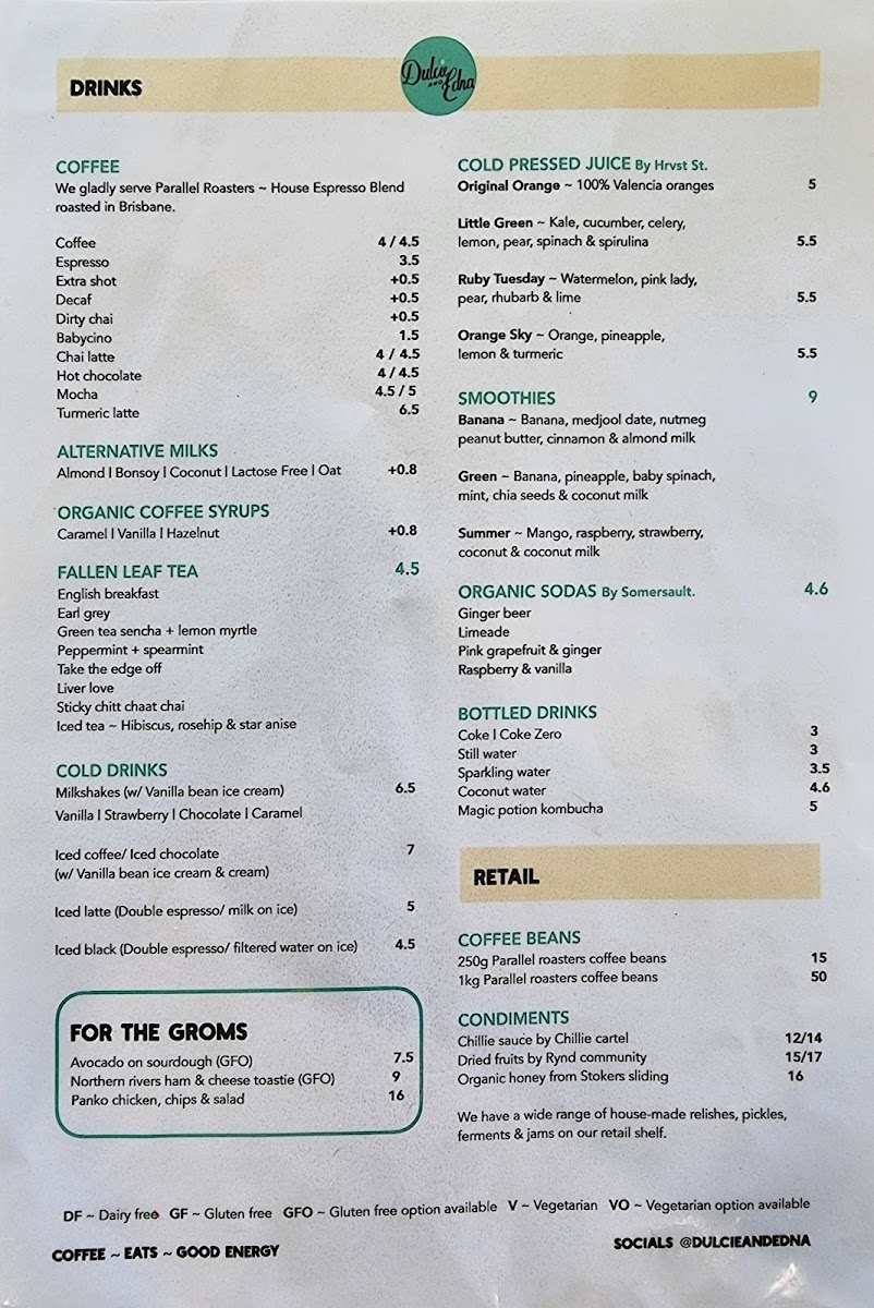 The menu at Dulcie and Edna is structured to cater to a range of casual dining needs including breakfast, lunch, and light meals. It features distinct groups of food and drink options suitable for different times of the day, from quick snacks to more substantial meals.